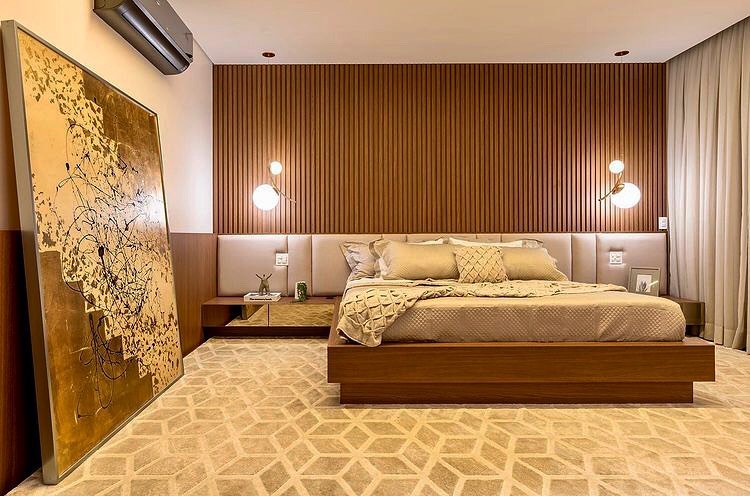 O ambiente conta com um painel ripado em madeira, que confere textura, movimento e um visual contemporâneo ao dormitório. Complementando o design, a cabeceira acolchoada proporciona aconchego e um toque de elegância, transformando o espaço em um verdadeiro refúgio para o descanso.